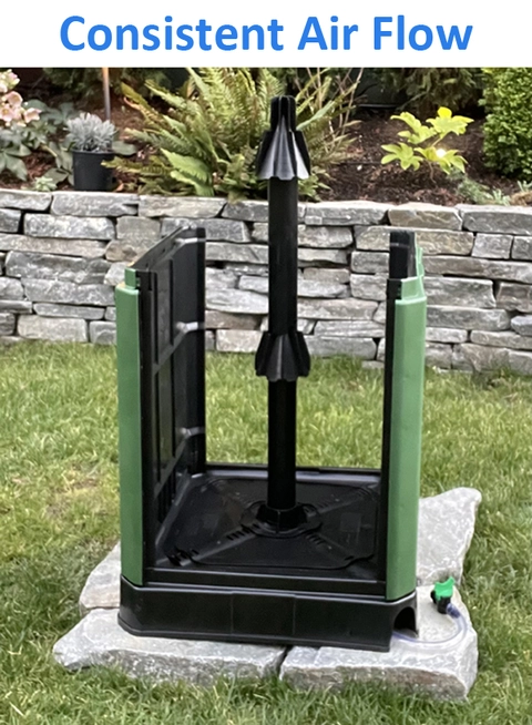 Center air lung draws air up from the ventilated base. Air in tube warms from the heat, that warm air rises pulling more air in. Air escapes from the two cones into the compost pile